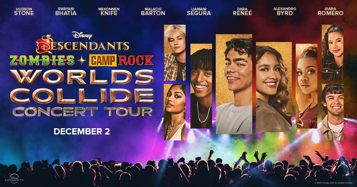 Toyota Center is excited to welcome the all-new Disney Worlds Collide Concert Tour, bringing together the worlds of “Descendants,” “ZOMBIES,” and for the very first time, “Camp Rock,” in an unforgettable new arena spectacular. A pop concert of the highest caliber, this year’s cast features an exceptionally talented lineup of Disney stars including Malachi Barton, Liamani Segura, Dara Reneé, Mekonnen Knife, Hudson Stone, Swayam Bhatia, Kiara Romero, and Alexandro Byrd. Fans will experience an evening packed with hit songs from all three franchises brought together in a brand-new production with fresh mashups, fan favorite songs, next-level choreography, and electrifying special effects. Come dressed as your favorite character, sing along all night, and experience the music and moments from “Descendants,” “ZOMBIES” and “Camp Rock” colliding on stage in this all-new concert experience.