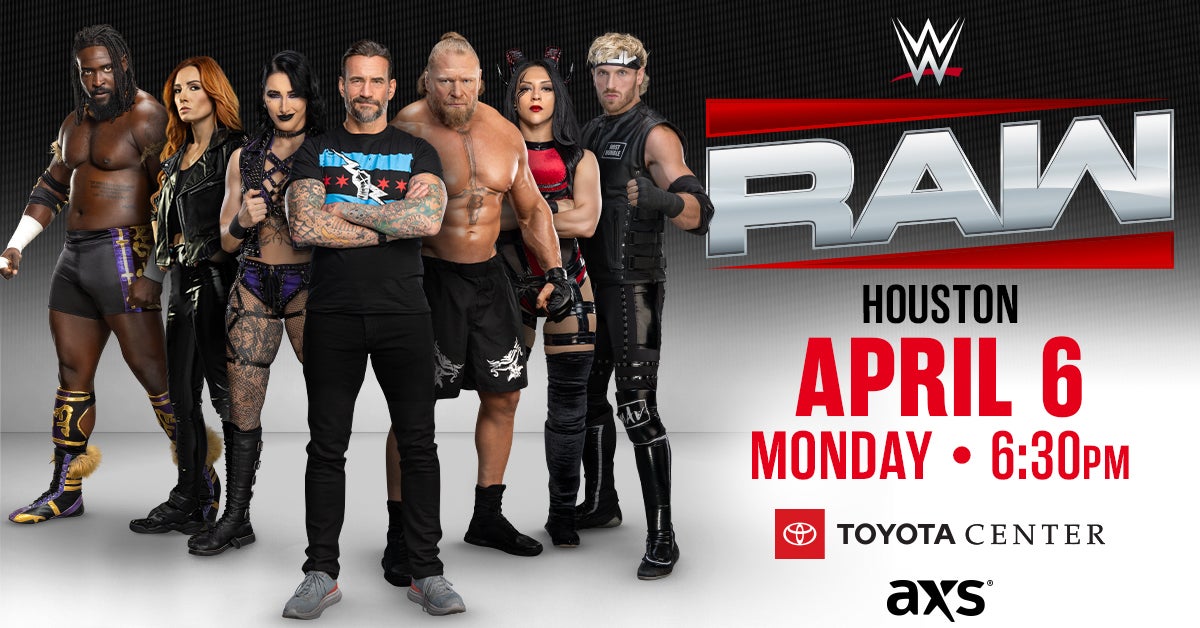 WWE is on the Road to WrestleMania and stopping in Houston with Monday Night RAW at Toyota Center on April 6! Don’t miss a special appearance from The Beast Incarnate Brock Lesnar! Plus, see your favorite WWE superstars like World Heavyweight Champion CM Punk, Women's World Champion Stephanie Vaquer, Intercontinental Champion Penta, World Tag Team Champions Logan Paul and Austin Theory, Obra Femi, Je'Von Evans, Becky Lynch, and many more!